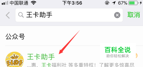 首先,我们点击打开微信添加公众号页面,然后输入王卡助手,点击关注如图所示的腾讯王卡官方公众号