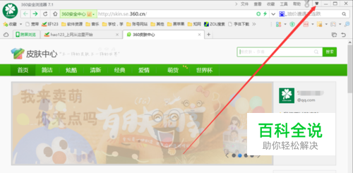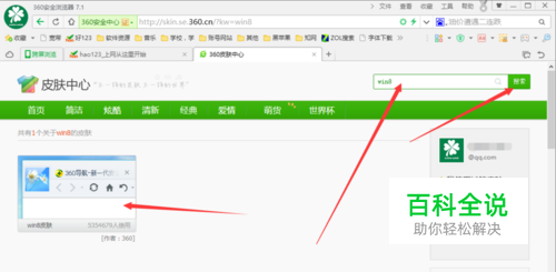 360安全浏览器7.1。打开浏览器,【1】点击右上角的皮肤按钮,进入皮肤中心。【2】搜索框内搜索“win8”,点搜索。【3】点击图片更换皮肤。就可以看到标签栏到顶上了
