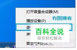 右键声音控制处的喇叭图标,弹出如下菜单,选择“录音设备”,看下图: