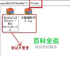 2, 将下载到的SFC游戏ROM,放到上面说的roms文件夹下,注意,ROM是ZIP格式,你可以改变ROM的名字,但是不要解压缩也不要改后缀名,比如下载《大航海时代2》得到的文件是 Uncharted Waters - New Horizons.zip,为了方便记忆你可以改成 大航海时代.zip。如图: