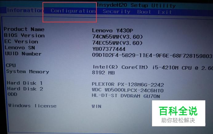 当我们在电脑开机的时候,按下F2键,打开主板BIOS设置页面,在该页面中,按下方向键将其切换至“Configuration”功能页面。