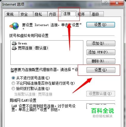 打开浏览器,选择浏览器上方的“工具”--“Internet选项”在“连接”选项卡点击“设置”