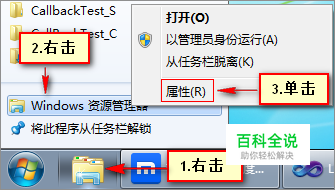 1. 右击,任务栏的”文件夹“图标,在弹出的菜单中,再次右击->”Windows资源管理器“,在弹出的菜单中,单击”属性“。 如下图所示: