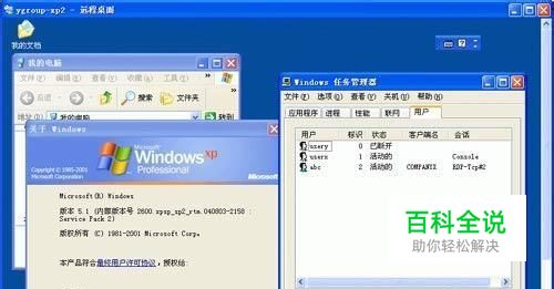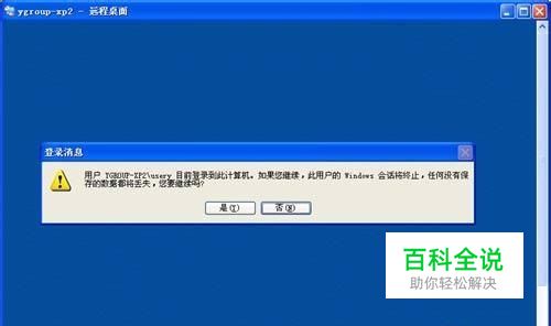 点击“连接”,COMPANYX上出现COMPANY-XP2远程桌面窗口,并提示说COMPANY-XP2电脑上已有另一个用户usery登录。如果继续登录COMPANY-XP2,其当前登录用户usery将被强行注销(见图2)。