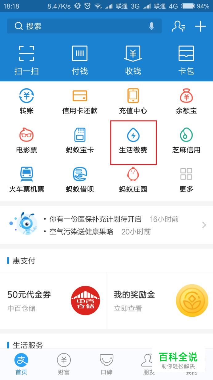 首先,我们打开支付宝客户端主页面,点击页面中的“生活缴费”菜单选项。