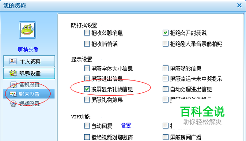 然后我们点击呱呱设置→聊天设置选项卡,在右侧勾选滚屏显示礼物信息的选项,如图所示: