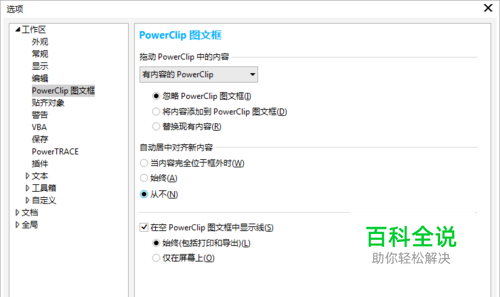 使用快捷键“Ctrl+J"或者菜单栏“工具>选项”命令,选择“工作区>PowerClip图文框”,在里面找到一项“自动居中对齐新内容”选择“从不”选项,即关闭自动居中对齐。
