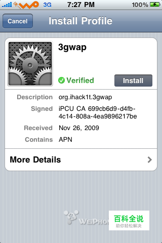 下载本帖的联通3GWap实用配置。 然后将你的iPhone与电脑连接,双击下载的3gwap.mobileconfig,将其导入iPhone配置实用工具资料库。 点击iPhone配置实用工具界面上的iPhone,点击配置描述文件,找到你刚刚导入的那个3gwap,点击安装。 你的iPhone屏幕上会出现确认安装的信息,依次点击install Install Now 正在安装... Done. 然后重启的你iPhone.
