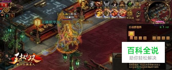 在王权无双中,舌战群儒阵中都是一些经典的诗词歌赋,第一次玩这样的阵法时候,你可能不太清楚阵中的规则,那么就会被阵中的守卫群殴致死,却没有半点还手之力!所以掌握必要的玩法是十分重要的。下面就介绍一些在王权无双中应该注意的事项吧! 首先找到王权无双舌战群儒阵法的所在位置,在游戏系统的右上方挑战里面第二个。点击进入后就会你来到了一个古色古香的地方,在室内会有一些士兵把手,这些士兵头上都会有一个字,而右侧会出现一段古语,对应的每个士兵就是这个古语里的一个字,你需要按照古语的顺序依次的击杀这些士兵。每一次的舌战群儒总共会有6波这样的诗词,总计一小时的时间,你需要的是:“准确、迅速出击。” 舌战群儒的活动每天随时都可以参加,但是每天只有一次机会,所以参与这个活动你需要一个相对空闲的时间,不然就会白白的丧失掉机会!这就是玩舌战群儒阵法中需要注意的一些地方。