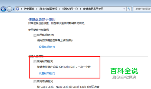 2、在弹出来的界面中,取消勾选“启用粘滞键”选项;