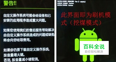 确认电脑已安装三星手机驱动。手机先完全的关机,然后同时按住手机的【音量下键】+ 【HOME键】+ 【电源键】,等待3秒,然后再按音量上键,进入界面为绿色机器人,此为刷机模式,如下图