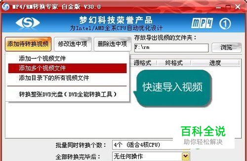 添加要转换成手机格式的视频 打开软件,点击主界面左上角的“添加待转换的视频”按钮,将待转成mp4的mov视频选择一个或多个文件的方式导入。该格式转换器运用了性能极高的多核CPU并发转换引擎,让单个或多个文件的转换速度达到业界最快。另外,该软件还附有一款专业的DVD Ripper,支持dvd转mp4、dvd转avi等等。