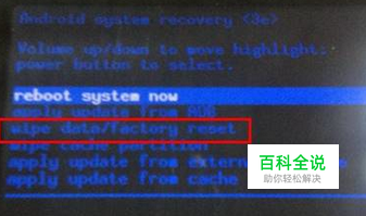 使用音量+和音量—键调整亮条至“wipe data/factory reset”即“清除数据恢复工厂设置”,按电源键确认