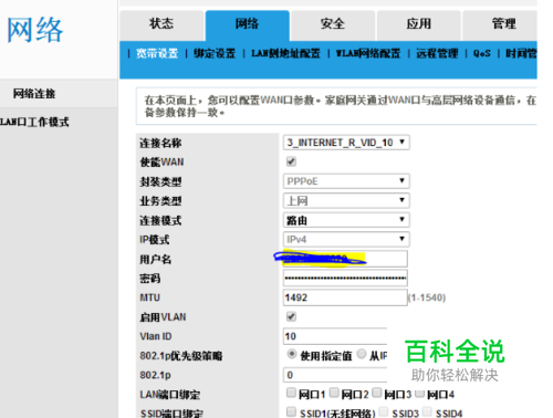 登录web管理,超级用户:telecomadmin、admintelecom、网络-宽带设置-新建,配制如下,用户名、密码是移动给的,注意不要端口绑定。