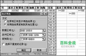 高级筛选 “高级筛选”一般用于条件较复杂的筛选操作,其筛选的结果可显示在原数据表格中,不符合条件的记录被隐藏起来;也可以在新的位置显示筛选结果,不符合的条件的记录同时保留在数据表中而不会被隐藏起来,这样就更加便于进行数据的比对了。 例如我们要筛选出“基本工资”或“职务工资”超过380且“实发”工资超过700的符合条件的记录,用“自动筛选”就无能为力了,而“高级筛选”可方便地实现这一操作。如图3所示,将“基本工资”、“职务工资”和“实发”三字段的字段名称复制到数据表格的右侧(表格中其他空白位置也可以),在图中所示位置输入条件,条件放在同一行表示“与”的关系,条件不在同一行表示“或”的关系。图4即为上述操作在新的位置(B20起始位置)筛选的结果。