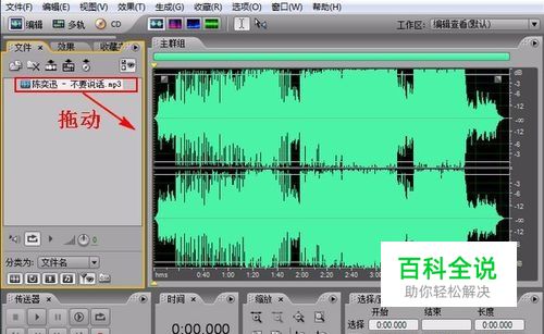 用“时间选择面板”工具,在音轨上拖动选择要删除的音轨部分,选择部分音轨内容之后在右下角可以看到选中部分在整个音频中的开始和结束时间,以及整个选中部分的长度,如果觉得选择部分不是很合适可以再自行进行调整。