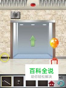 使用刀子将连接气球的绳子割断,利用重力感应使气球触碰红色按钮即可打开电梯门。