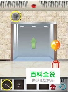 第四十五关,游戏的目的是让气球碰到电梯门上方的红色开关。首先用储物箱的锤子将门左上方的喷气盒子敲坏。