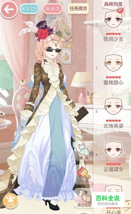 这次小夕带来的攻略需要花一定的钻石,衣服的属性都非常的高,如果其中几件的小伙伴可以用上面五个属性相似的搭配代替,千万不要用其他属性哦。 发型:云端舞娘(商店68钻石) 连衣裙:高腰娃娃裙·蓝(系统赠送) 外套:吾皇至上(商店89钻石)属性很好值得购买 袜子:海上花·华丽(进化) 鞋子:玫瑰雪魄(完成成就) 头饰:贵妇礼帽(幻阁;如果没有可以用华丽、优雅的头饰替换) 耳饰:穗耳环·粉(商店550) 颈饰:归真(商店2453) 手饰:朋克手镯+海滩手环+铆钉手套(手饰随意搭配) 手持:真皮钱包(手持越多越好) 妆容:信鸽少女 特殊:戒备时刻(商店804)
