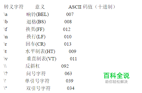四、转义字符 转义字符是C语言中表示字符的一种特殊形式。通常使用转义字符表示ASCII码字符集中不可打印的控制字符和特定功能的字符,如用于表示字符常量的单撇号( '),用于表示字符串常量的双撇号( ")和反斜杠( \)等。转义字符用反斜杠\后面跟一个字符或一个八进制或十六进制数表示。 转义字符的作用:表示控制代码;表示字符和字符串常量;表示用ASCII符集中任意字符。 字符常量中使用单引号和反斜杠以及字符常量中使用双引号和反斜杠时,都必须使用转义字符表示,即在这些字符前加上反斜杠。 在C程序中使用转义字符\ddd或者\xhh可以方便灵活地表示任意字符。\ddd为斜杠后面跟三位八进制数,该三位八进制数的值即为对应的八进制ASCII码值。\x后面跟两位十六进制数,该两位十六进制数为对应字符的十六进制ASCII码值。 使用转义字符时需要注意以下问题: 1) 转义字符中只能使用小写字母,每个转义字符只能看作一个字符。 2) \v 垂直制表和\f 换页符对屏幕没有任何影响,但会影响打印机执行响应操作。 3) 在C程序中,使用不可打印字符时,通常用转义字符表示。 下图给出了C语言中常用的转义字符。