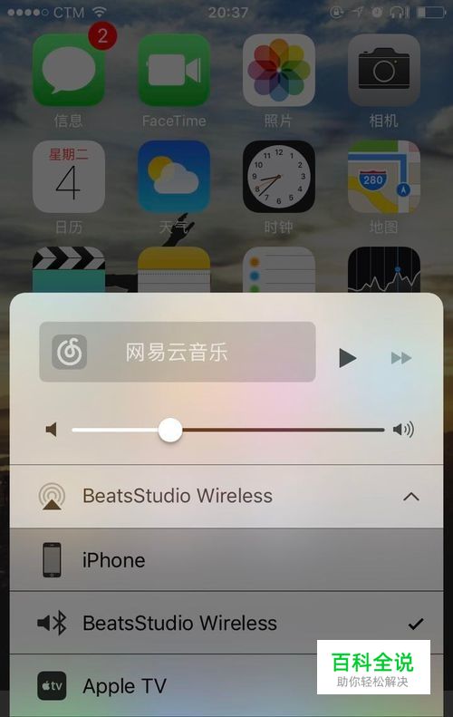 当连接成功后要确认输出源,返回iPhone 主界面. 从界面下端向上扫,会弹快捷控制界面.再横扫进入音源输出控制界面, 当查看是否音源输出设备.如果不是,请自行选择BeatsStudio Wireless作为音源输出设备.