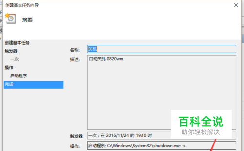 在程序或脚本中输入“C:\Windows\System32\shutdown.exe ”,在添加参数中输入“-s”