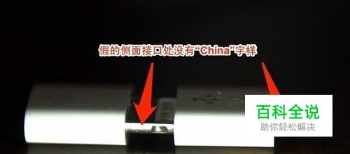 看Lighting 转接头侧面,真货有“China”的字样,而假的没有