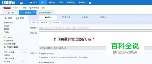 在弹出的标签页中,可以看到短信编辑功能。 在“接受手机”处填写手机号码, 可同时发给10人,以逗号“,”隔开,支持向移动、联通、电信用户发送! 注意: 手机号用英文半角逗号隔开,即可批量给好友发短信了。 在“短信内容”处,填写短信内容。