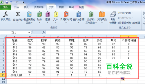 然后将鼠标放在 I-2 单元格的右下角按住往下拖动到 I-10 单元格。 不及格人数 根据以上步骤写公式即可。