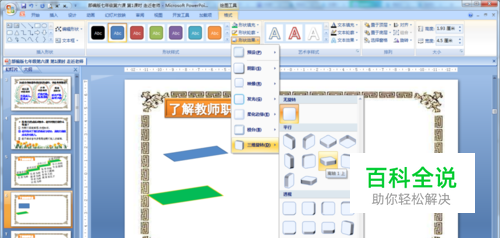 首先先画一个矩形——双击矩形,弹出格式菜单——选择形状效果——三维旋转——选择形状“离轴1上”。