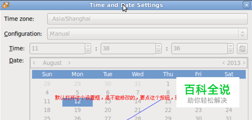 接着就打开时间和日期设置对话框,我们的操作都是在这里完成,打开后,默认是不能修改的,看图中提示,请一定要注意图中箭头所指的那个按钮。