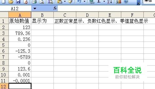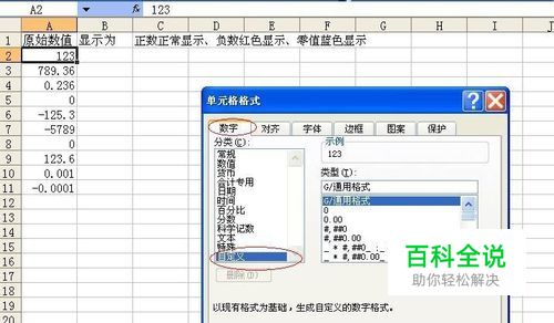 选中A2单元格,按下ctrl+1打开“单元格格式”对话框,在“数字”标签下选择“自定义”,在右侧“类型”框中输入格式代码:G/通用格式;[红色]G/通用格式;[蓝色]G/通用格式 ,确定即可。