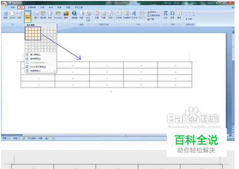 开Word 2007,点击"插入"选择卡中的"表格下拉列表",然后在出现的图示表格中随意滑动来确定要绘制的表格的大小,最后点击以完成单元格的绘制工作。