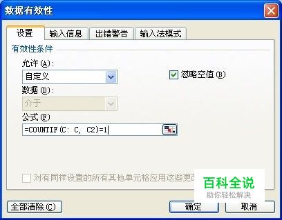 第一,设置有效性条件验证: 我们假设C列为员工“身份证号”字段,C2单元格为第一个员工的身份证号码所在的单元格。在未输入之前,先设置该列的有效性条件来确保该列数据的唯一性。 选中C2单元格,单击“数据”菜单中的“有效性”命令,弹出“数据有效性”对话框,选择“设置”选项卡,在“允许”下拉列表中选择“自定义”,在“公式”框内输入“=COUNTIF(C: C, C2)=1”