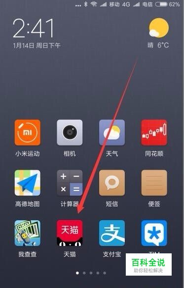 在手机上滑动屏幕,找到“天猫”的图标,点击后登录手机开猫