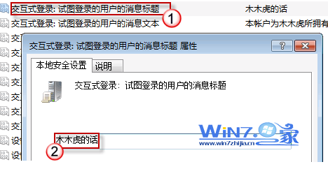4、完成上面的步骤之后,还要设置消息标题,双击“交互式登录: 试图登录的用户的消息标题”,然后输入标题内容(比如:木木虎的话),单击“确定”保存就可以了。