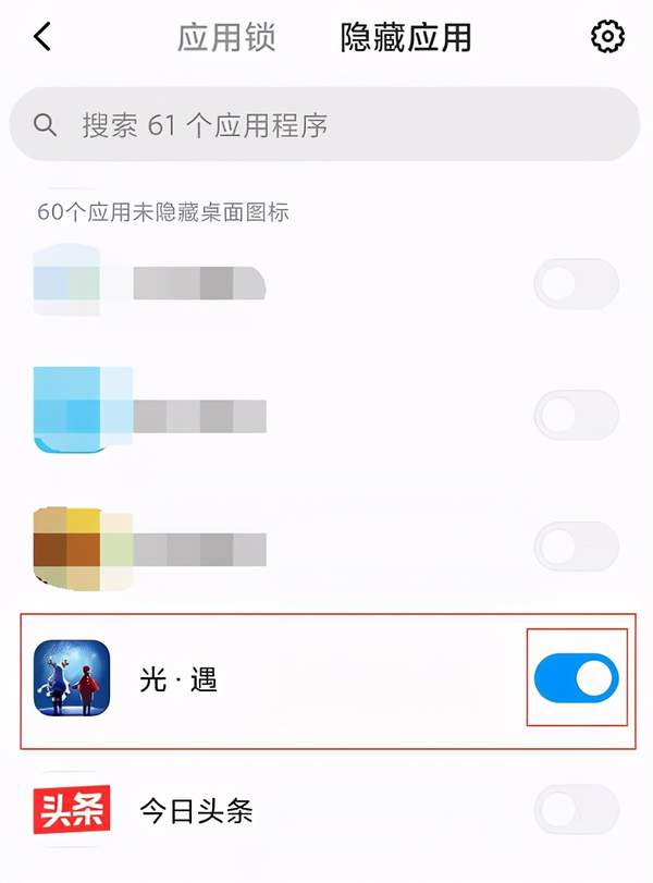 第五步、在“隐藏应用”界面,选择想要隐藏的游戏,并打开它右边的开关。