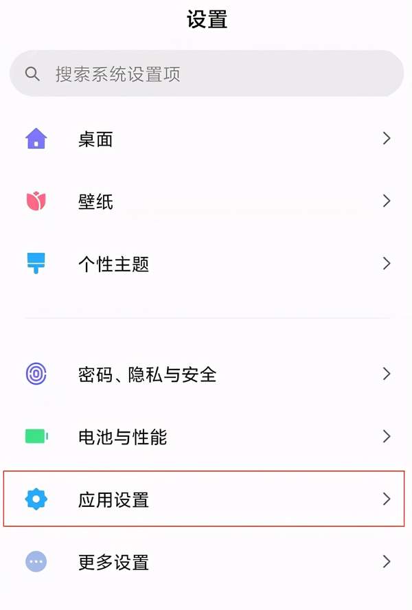 第二步、在“设置”界面,找到“应用设置”按钮并点击,进入“应用设置”界面。