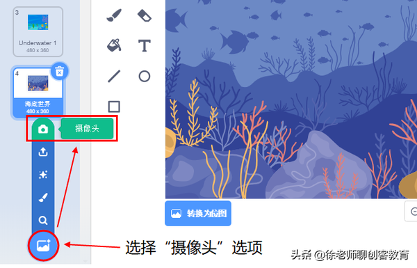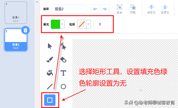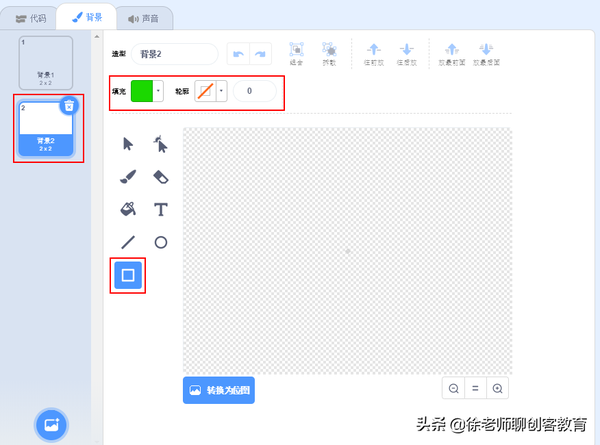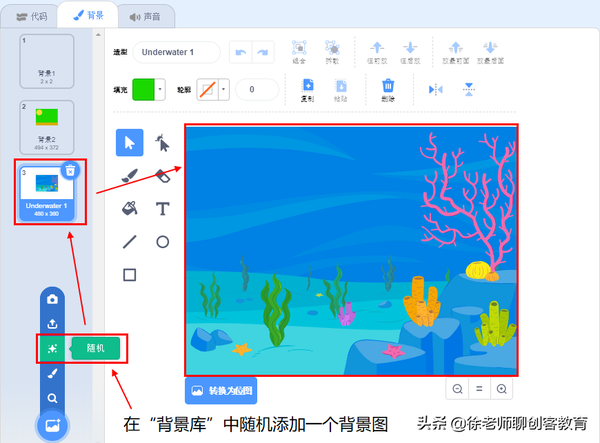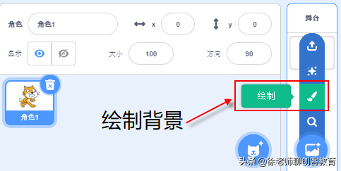本节介绍一下Scratch绘制背景功能,在"背景"区中单击添加"背景"图标,在弹出的菜单中选择"绘制"选项,如下图所示: