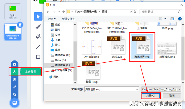 8、点击"上传背景"这个图标,弹出"打开"窗口,选中本地背景图"海底世界.svg"文件,点击"打开"按钮,就可以上传一个新的"背景图",如下图所示。