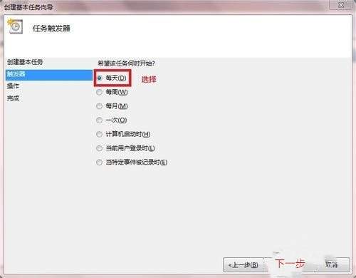 在“触发器”选项里设置任务开始时间为“每天”,单击“下一步”。