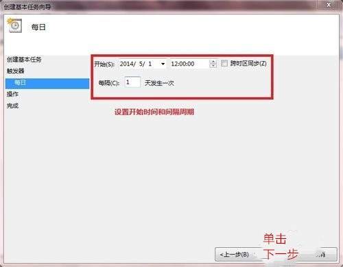 设置开始时间为“2014年5月1日12:00”、间隔周期为“每隔1天发生一次”,单击“下一步”。