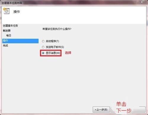 在“操作”选项里选择“显示消息”,单击“下一步”。