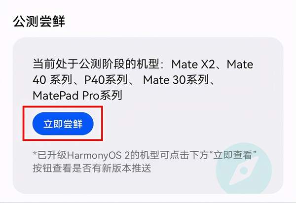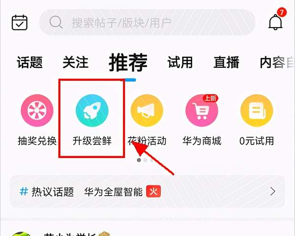 1.打开“我的华为”,点击“升级尝鲜” / 打开“花粉俱乐部”,点击“公测尝鲜”。