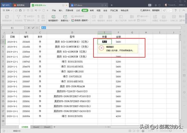 经过以上操作后,在E3:E18中如果输入除数字以外的其他内容就会出现错误提示警告
