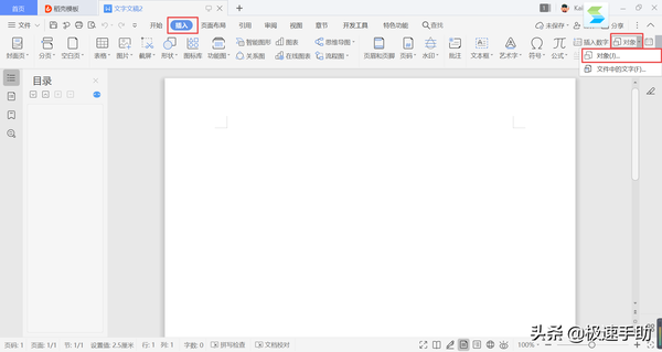 第一步,首先我们用WPS打开需要插入数学公式的Word文档,然后找到工具栏上方的【插入】选项卡,接着,找到【对象】命令,再选择【对象】。