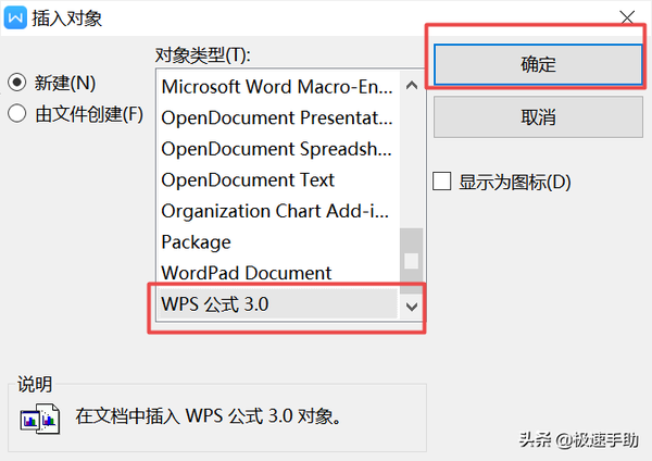 第二步,接着在弹出的【插入对象】窗口当中,一直下拉找到【WPS公式3.0】选项,然后进行选择,最后单击窗口右侧的【确定】按钮就可以了。