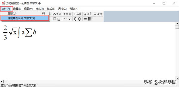 第五步,公式编辑好以后,我们单击窗口上的【文件】选项,然后选择【退出并返回到...】的选项。