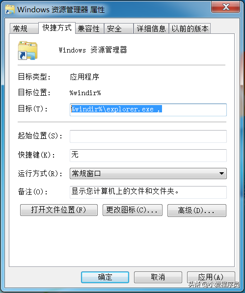 把目标栏中的内容修改为“%windir%\explorer.exe ,”,也就是原内容之后添加了一个空格和一个英文逗号,然后确定保存。