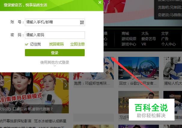 点击我们搜索的官网点击打开,进入爱奇艺的界面,在该界面内找到登陆选项,弹出登录对话框,如图所示: